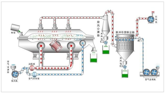 物料自进料口进入机内, 在振动力作用下, 物料沿水平方向抛掷向前连续运动,热风向上穿过流化床同湿料换热后, 湿空气经旋风分离器除尘后由排风口排出, 干燥物料由排料口排出。